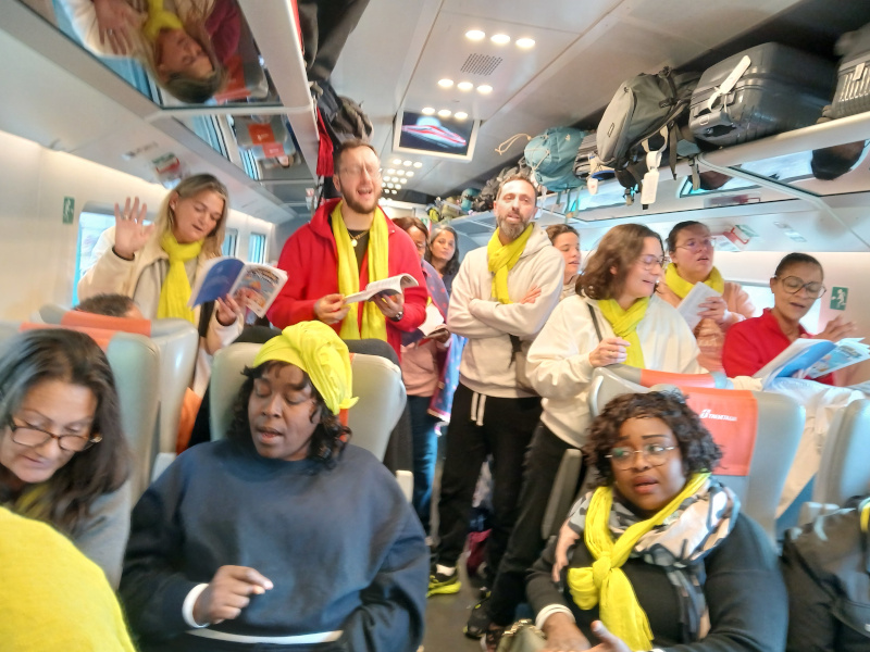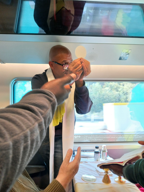 De nombreuses personnes sont allées en avion, mais un groupe de 70 personnes a fait le voyage en train. Le pèlerinage a commencé dans le train avec en particulier la célébration de l’Eucharistie.