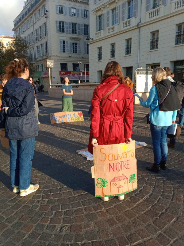 Ce dimanche après-midi 16 novembre sur la Canebière, juste en face du Vieux Port, un groupe silencieux, en cercle autour d’une bougie, tranche avec le bruit et l’agitation ambiants. Sur un simple morceau de carton, on peut lire « Ici on prie pour la COP30, soyez les bienvenu(e)s », sur un autre « Notre silence est un cri pour le climat ». Quelques organisateurs distribuent des flyers et donnent, à voix basse, des explications supplémentaires à celles et ceux qui passent autour du cercle. Pendant une heure, la taille de ce dernier se module pour accueillir entre 10 et 20 personnes qui restent le temps qu’elles souhaitent. L’ambiance est paisible et recueillie et la prière semble inclure les nombreux passants et les manifestants pour la Palestine, sous l’ombrière toute proche, qui relaient le cri de souffrance des Palestiniens uniquement au son de nombreux tambours. Après que ces derniers se soient tus, une femme portant un drapeau palestinien est venue rejoindre le cercle : court mais intense moment de communion pendant lequel deux cris pour la justice et la paix se sont unis…